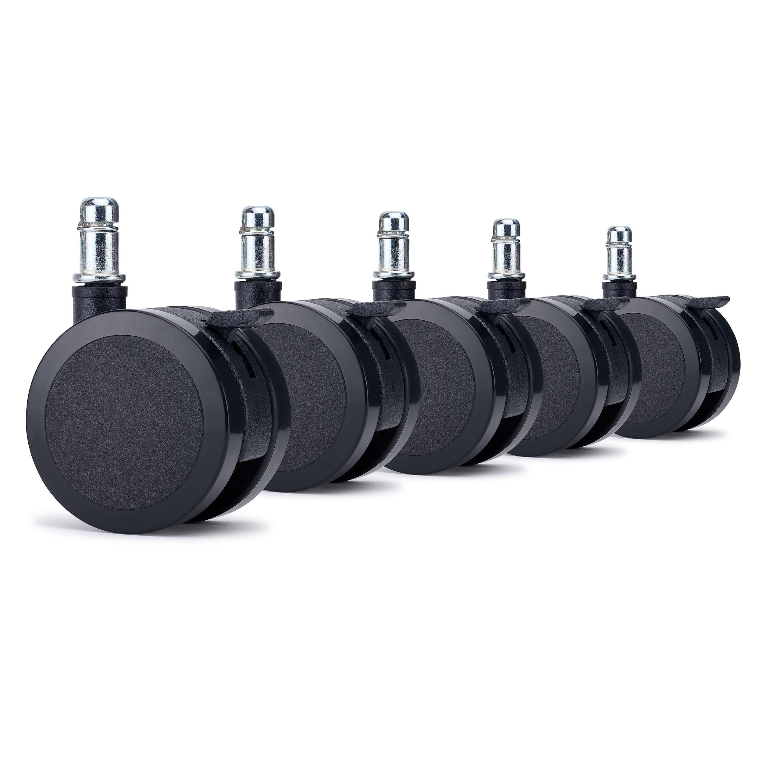 Lot de 5 roulettes pour chaises de bureau BRAKE, antidérapantes et équipées d’un système de frein pratique. Grâce à ce mécanisme, vous pouvez utiliser votre chaise en toute stabilité et en toute sécurité.
