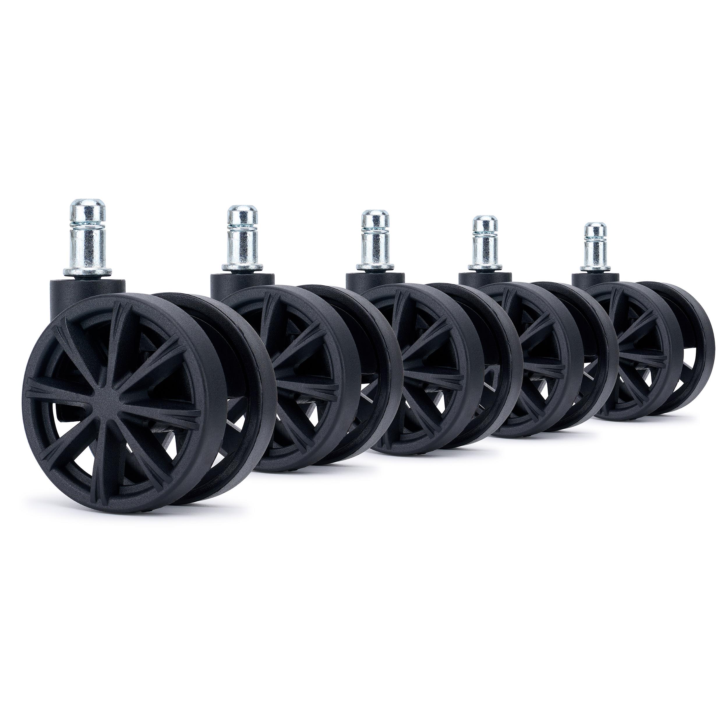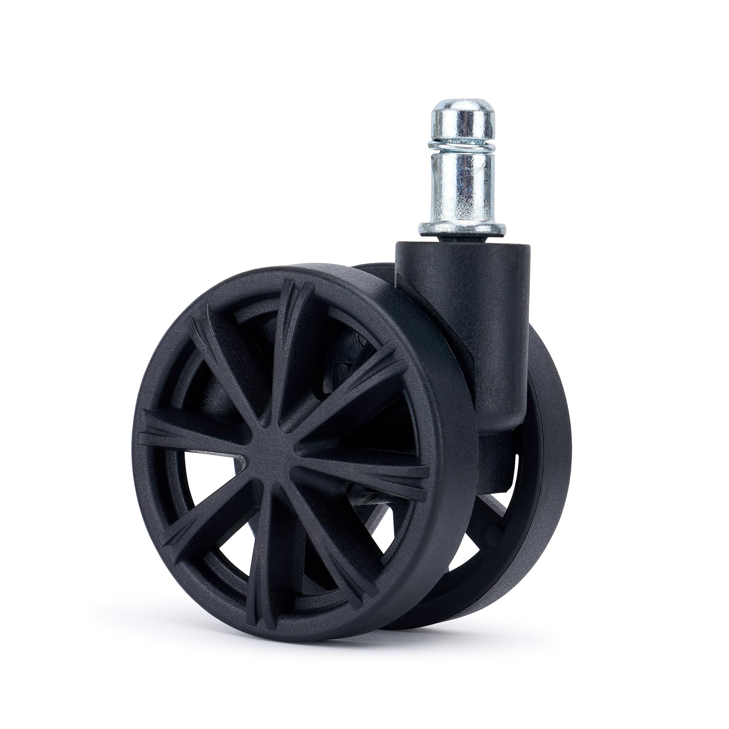 Lot de 5 roulettes pour chaises de bureau SPOKE. Ces roulettes se distinguent par leur design moderne et élégant, caractérisé par une structure à rayons fins et dynamiques qui apporte une grande légèreté visuelle et un style résolument contemporain. Leur couleur noire uniforme et leurs lignes épurées en font un élément esthétique raffiné, capable de valoriser n’importe quelle chaise de bureau, qu’elle soit directionnelle ou opérationnelle.