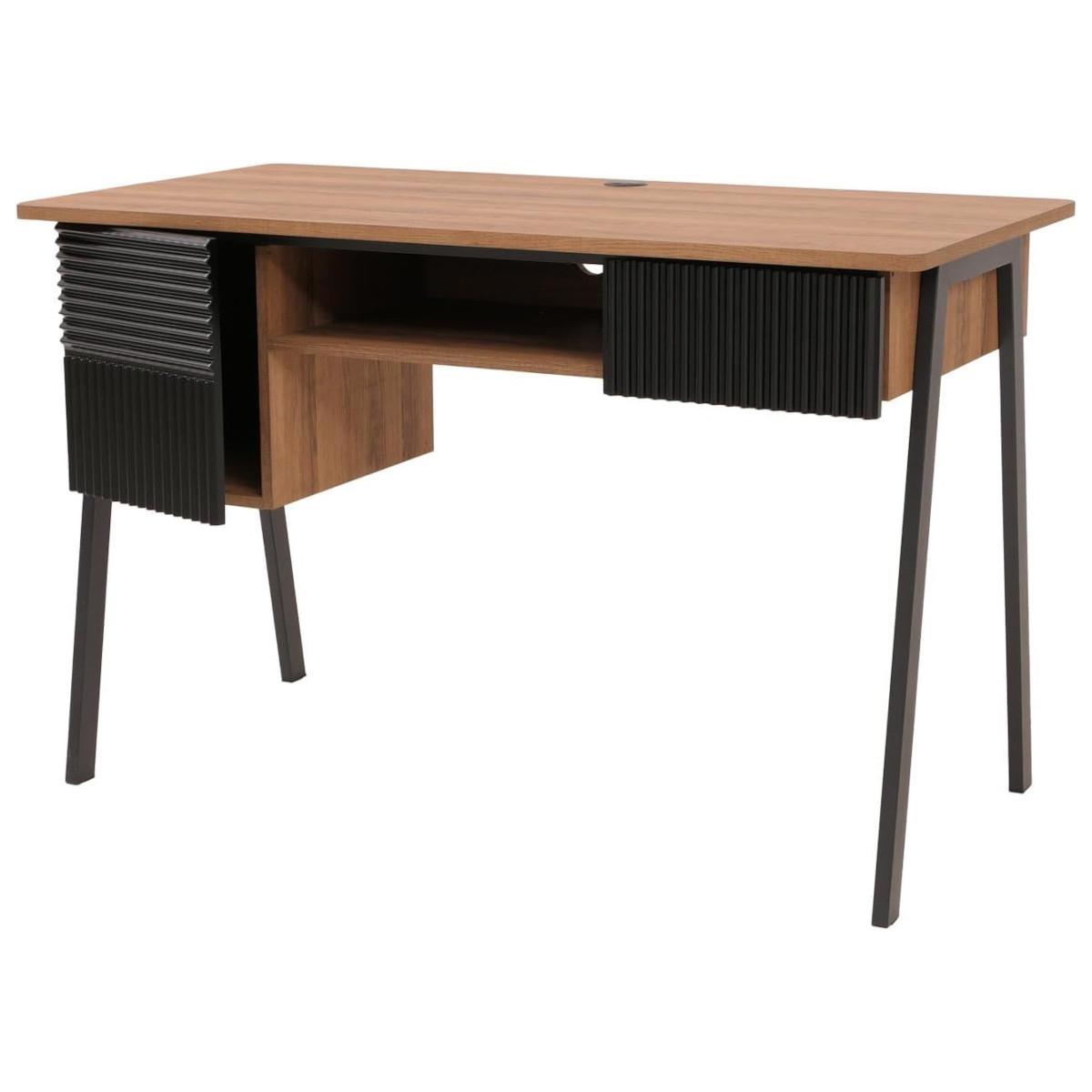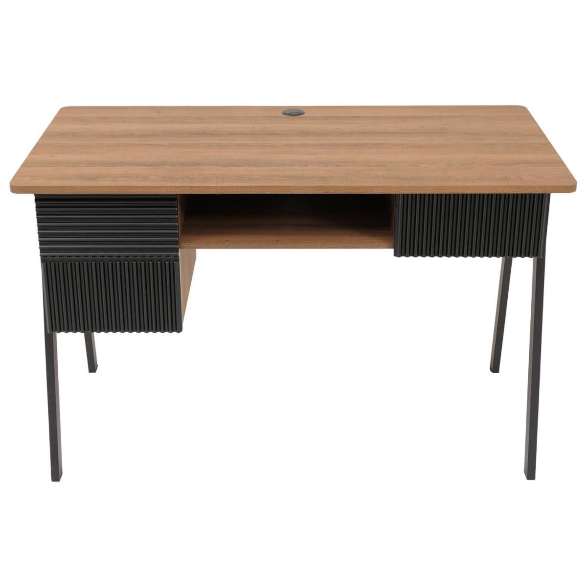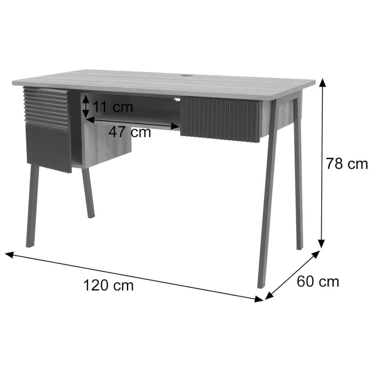 Au centre, un grand compartiment ouvert (47 x 38 x 11 cm) constitue un espace de rangement supplémentaire très pratique, parfait pour y glisser un clavier ou des documents à consulter régulièrement. Les façades des rangements fermés présentent un élégant motif en relief noir, qui apporte une touche esthétique distinctive.