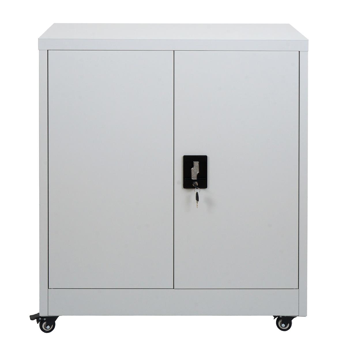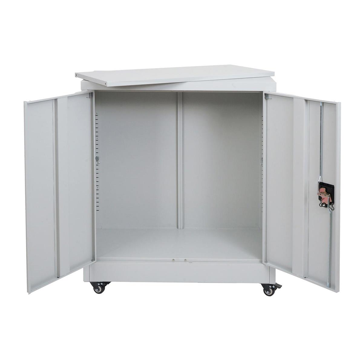 Ce meuble présente des dimensions de 98 cm de hauteur, 80 cm de largeur et 40 cm de profondeur, offrant un large espace de rangement. Sa structure est fabriquée en acier avec revêtement poudre, un matériau très résistant aux chocs, rayures et à l’usure quotidienne. De plus, il est équipé de deux portes battantes avec serrure et clé, assurant la sécurité du contenu en toutes circonstances.