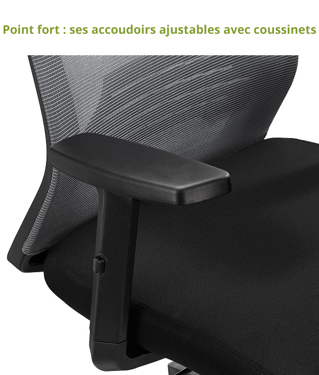 Les accoudoirs sont ajustables en hauteur et ils sont dotés de coussinets en caoutchouc. Comme vous pouvez le constater sur les photos, ils sont également solides et très stables. Grâce à eux, l'utilisateur pourra adopter une posture adéquate qui lui permettra de travailler de la manière la plus efficace.