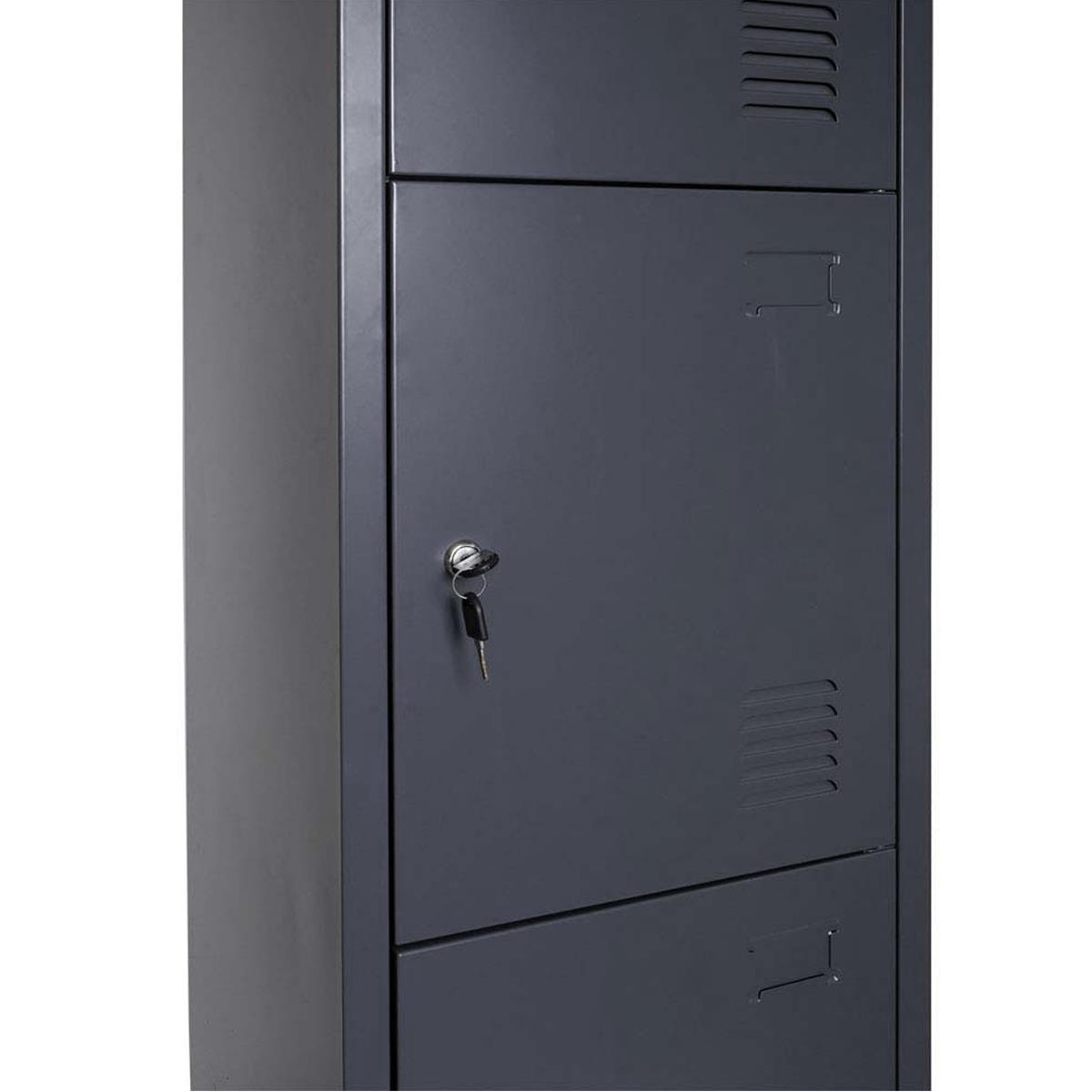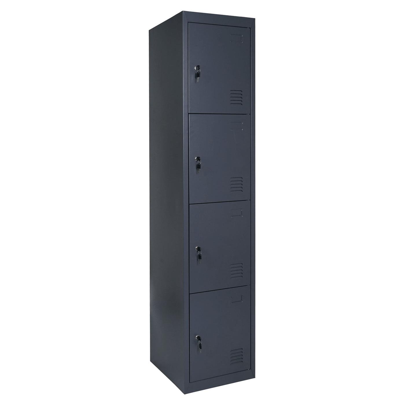 Ses dimensions sont de 180 x 38 x 45 cm, une taille compacte et à la fois polyvalent puisque vous pourrez le mettre n'importe où et optimiser au maximum l'espace. Il possède 4 portes avec serrure individuelle et un jeu de clés extra chacune.