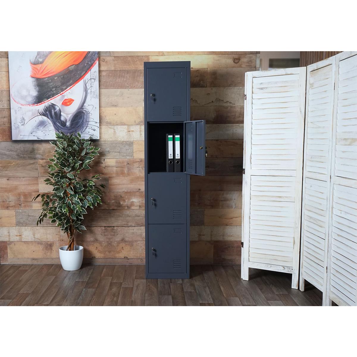 Ce meuble casier métallique HILDUR est idéal pour le stockage sécurisé de classeurs, documents, etc. Il possède 4 portes avec serrure individuelle, parfait pour ranger le contenu en totale sécurité. Sa construction en acier garantit un produit avec une durabilité et résistance hors du commun.