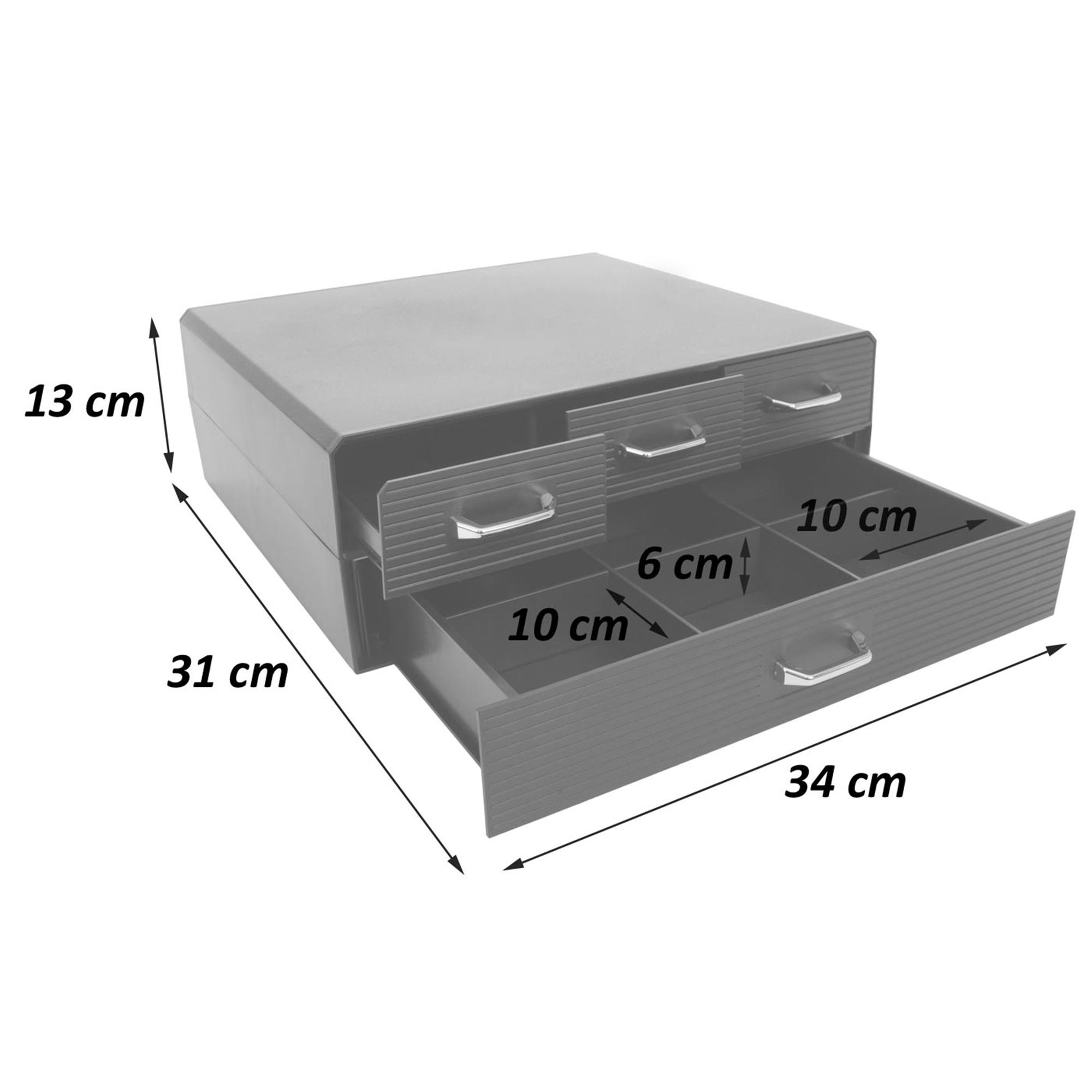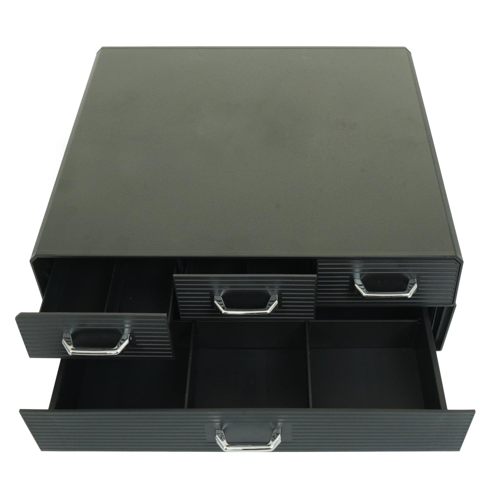 Cet accessoire est indispensable au quotidien, il permet non seulement l'optimisation de votre espace et son maintien en ordre mais il permet aussi d'adopter une bonne posture en plaçant l'écran à hauteur des yeux. Les quatre tiroirs à poignées comportent un total de 15 compartiments, permettant une organisation optimale.
